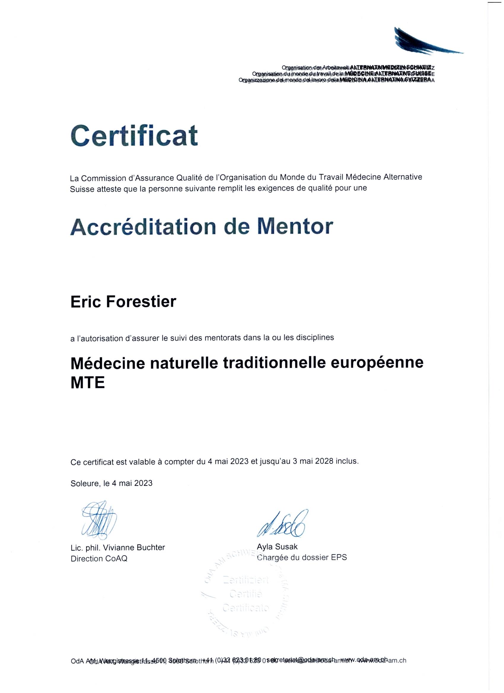 Contact : Eric Forestier au 078 912 34 67 ou par email par le formulaire du site ; Naturopathe avec diplôme fédéral en MTE (ICI le diplôme), Formateur d'adultes avec Brevet fédéral (ICI le brevet). Consultez ICI l'accréditation comme Mentor OrTra MA (OdA AM)